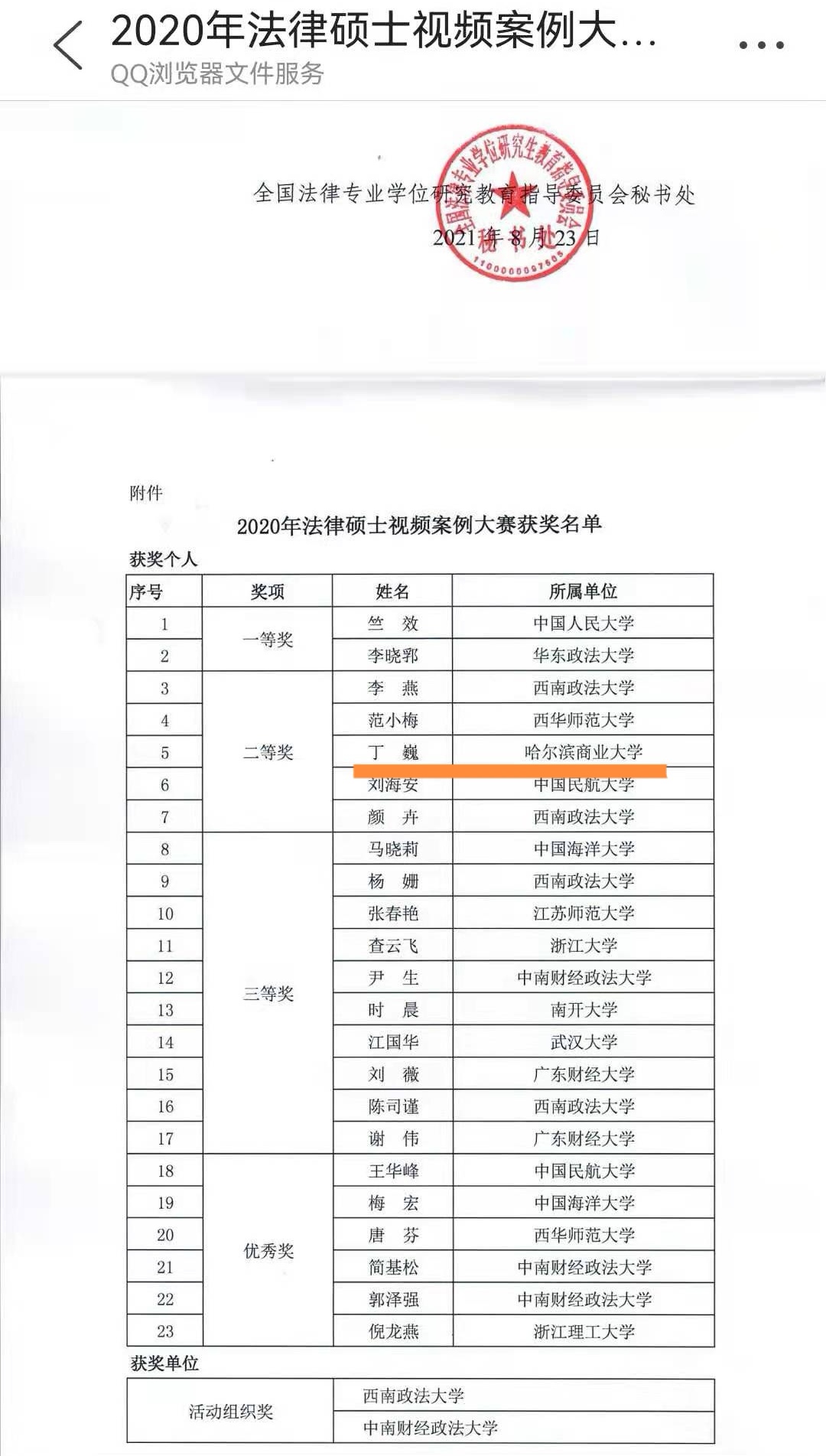 2021年8月23日全国法律专业学位研究生教育委员会秘书处公布了2020年法律硕士视频案例大赛获奖名单,我校法学院丁巍博士的视频案例继文字案例入库后,视频案例再次入库并荣获二等奖。此次视频案例大赛中,丁巍博士的表现凸显其对法律实践勇于探索、不断创新的能力及全面发展的个人风采,也为我校法律硕士师资队伍增光添彩。