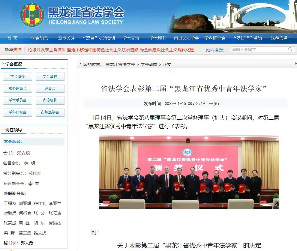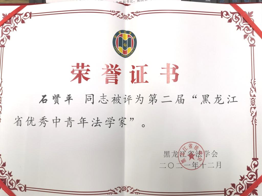 为响应中国法学会要求和我省学术界期待,培养和激励我省优秀法学人才,搭建优秀法学人才脱颖而出的平台,激励广大法学工作者、法律工作者坚持正确的政治方向、创新法学研究,深入学习和践行习近平法治思想,黑龙江省法学会组织开展了第二届“黑龙江省优秀中青年法学家”评选活动。经过广泛动员、民主推荐、集中评选、评选委员会终评、媒体公示,十名同志获评第二届“黑龙江省优秀中青年法学家”,我校法学院石贤平荣获第二届“黑龙江省优秀中青年法学专家”称号。2022年1月14日,黑龙江省法学会第八届理事会第二次常务理事(扩大)会在哈尔滨召开,省委常委、政法委书记、省法学会会长张安顺出席会议并讲话,会议期间,对第二届“黑龙江省优秀中青年法学家”进行了表彰。