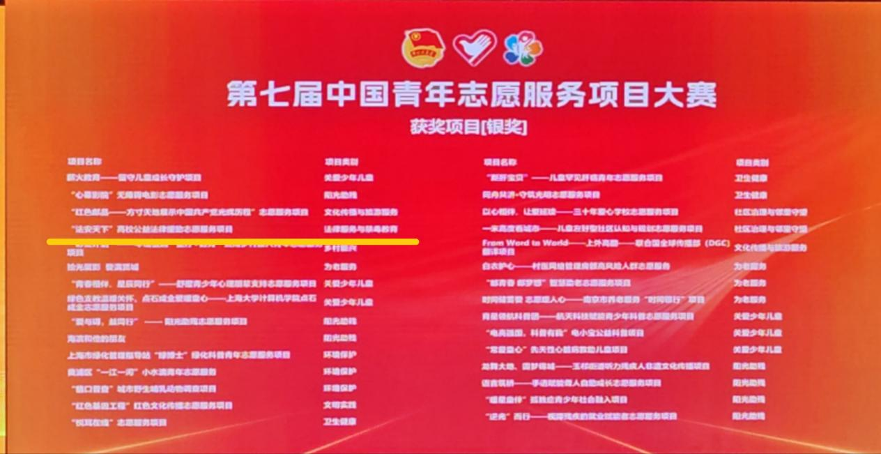 近日由共青团中央、中央社会工作部、民政部、水利部、文化和旅游部、国家卫生健康委员会、中国残疾人联合会和中共广东省委、广东省人民政府共同主办的第七届中国青年志愿服务项目大赛全国赛终评于11月30日至12月1日在广东汕头举办。1001个项目入围全国赛终评。其中,排名前501的项目通过线下路演答辩,评委、监委线下集中评审的方式进行了评审和交流。我校大学生法律援助中心申报的《“法安天下”高校公益法律援助志愿服务项目》喜获第七届中国青年志愿服务项目大赛银奖。