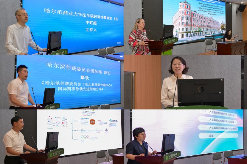 研讨环节中,俄罗斯联邦工商会仲裁院远东分院院长普里塞金娜・娜塔莉亚、哈尔滨仲裁委员会国际部部长慕钦、北京德和衡(哈尔滨)律师事务所律师李岳、北京大成(哈尔滨)律师事务所律师孙健、哈尔滨商业大学法学院副教授司丹先后发言,分别围绕国际商事仲裁权利保护、国际商事仲裁先进经验、出口管制与制裁风险管理、俄罗斯商事仲裁制度、人工智能在商事仲裁中的应用议题作报告,为中俄贸易合规发展提供了兼具理论深度与实践价值的思路。