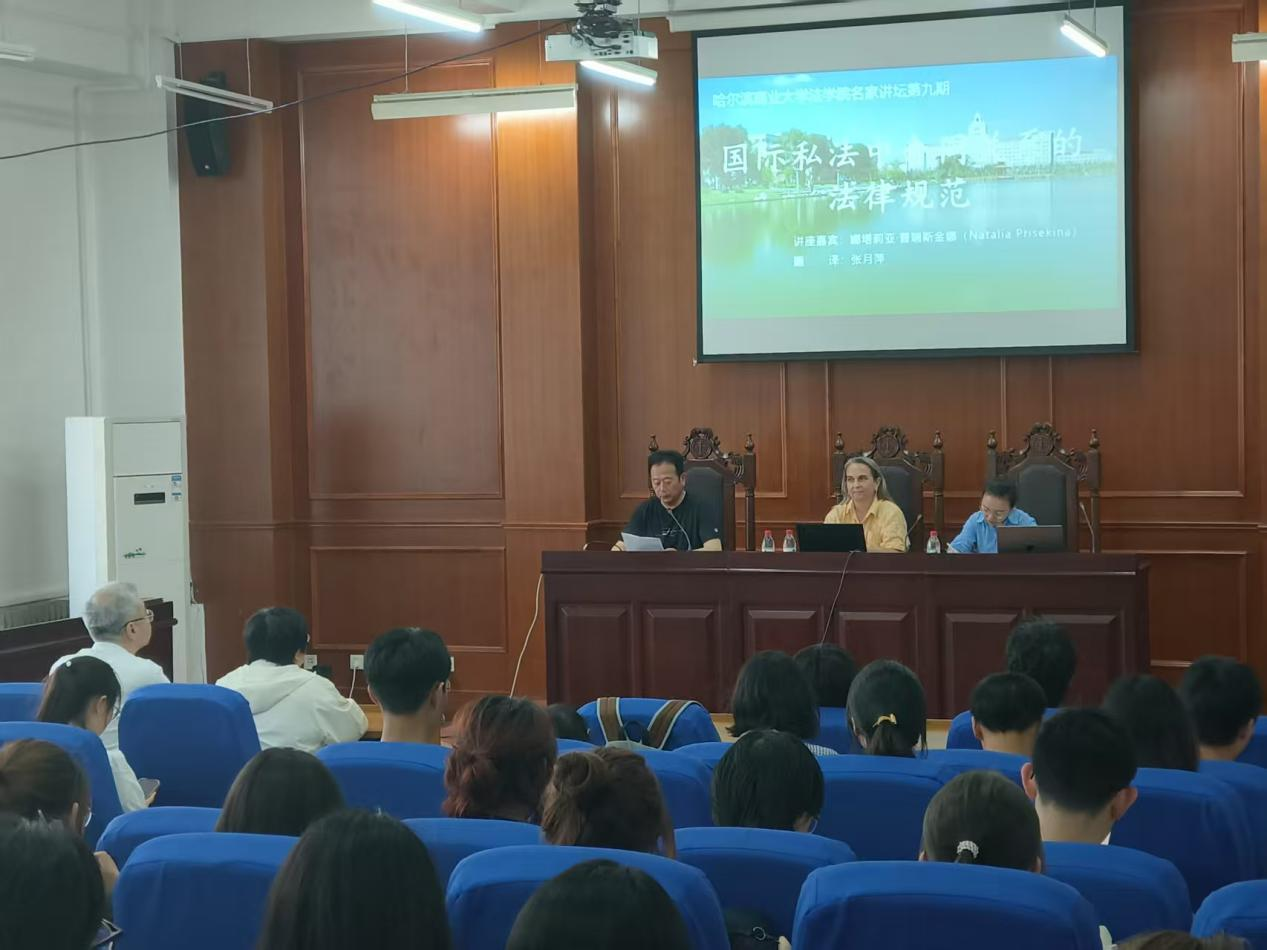 哈尔滨商业大学法学院第九期名家讲坛于2025年6月19日在教学主楼一楼模拟法庭举行。此次讲坛邀请到了原俄罗斯远东联邦大学法学院国际关系主管,现任俄罗斯联邦国际商事仲裁法院符拉迪沃斯托克分院院长、海事仲裁委员会负责人、全俄社会组织 “俄罗斯律师协会” 滨海边疆区国际关系理事会副主席娜塔莉亚·普瑞斯金娜教授作为主讲嘉宾,由法学博士、黑龙江大学俄语学院助理研究员、外国语言文学博士后流动站在站博士后张月萍老师担任翻译。法学院院长高勇教授主持,法学院部分教师、研究生、本科生共同聆听了这场学术盛宴。