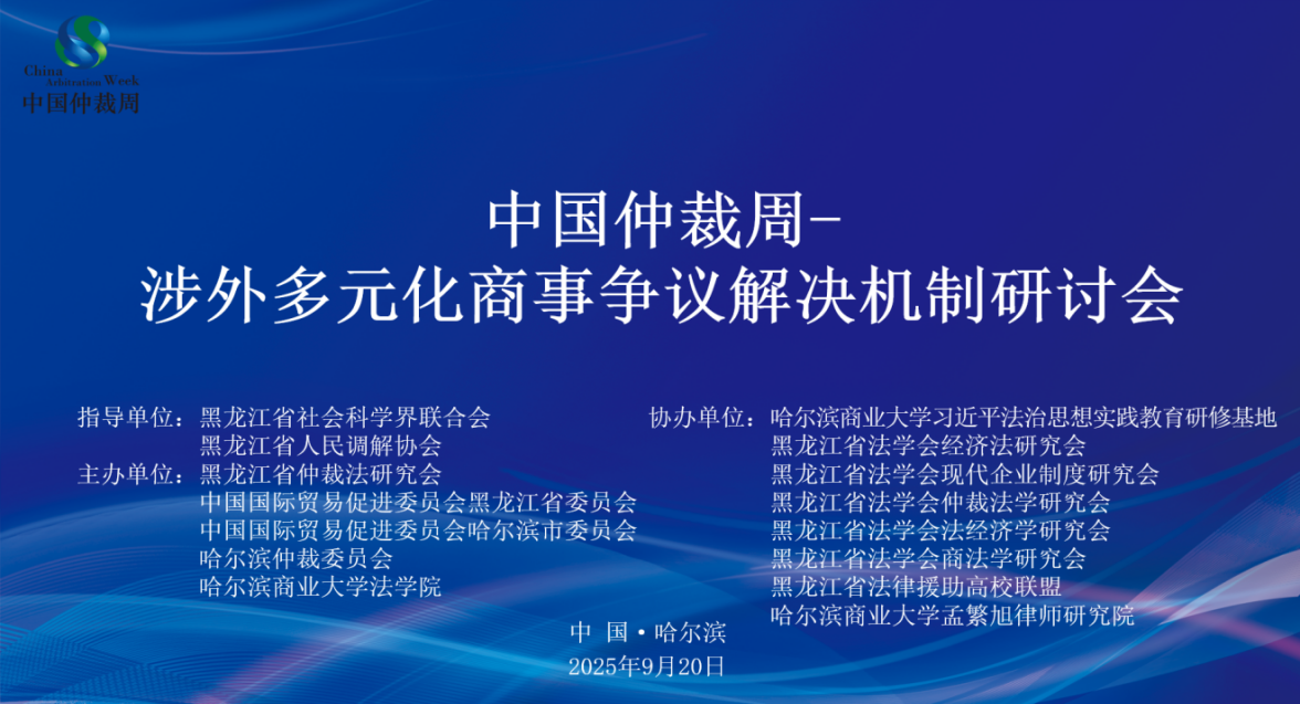 2025年9月20日上午,第十三届中国仲裁周(2025)“涉外多元化商事争议解决机制研讨会”在哈尔滨商业大学北校区主楼四楼法学院多功能厅成功举办。本次会议由黑龙江省社会科学界联合会、黑龙江省人民调解协会指导,由哈尔滨商业大学法学院、黑龙江省仲裁法研究会、中国国际贸易促进委员会黑龙江省委员会、中国国际贸易促进委员会哈尔滨市委员会、哈尔滨仲裁委员会联合主办,并由哈尔滨商业大学习近平法治思想实践教育研修基地、黑龙江省法学会经济法研究会、黑龙江省法学会现代企业制度研究会、黑龙江省法学会仲裁法学研究会、黑龙江省法学会法经济学研究会、黑龙江省法学会商法学研究会、黑龙江省法律援助高校联盟、哈尔滨商业大学孟繁旭律师研究院协办。会议旨在聚焦涉外多元化商事争议解决核心议题,搭建学界与实务界交流平台,为深化区域涉外经贸合作提供法治支撑。